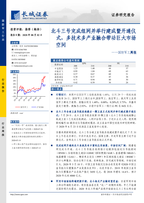 【长城证券】【20200802】20200802-长城证券-国防军工周报:北斗三号完成组网并举行建成暨开通仪式,多技术多产业融合带动巨大市场空间-19页