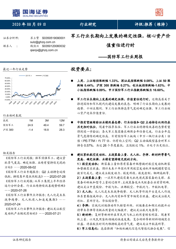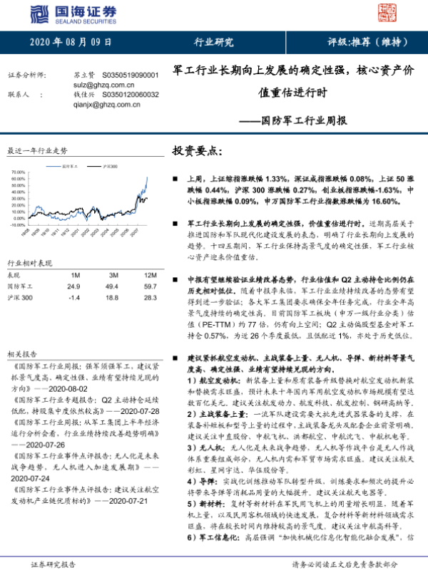 【国海证券】【20200809】20200809-国海证券-国防军工行业周报:军工行业长期向上发展的确定性强,核心资产价值重估进行时-12页