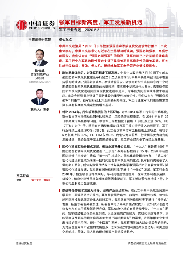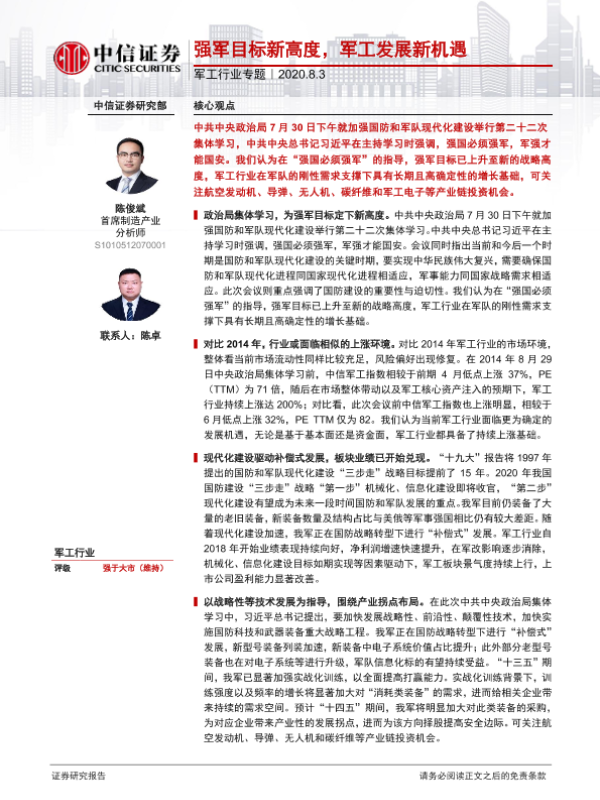 【中信证券】【20200803】20200803-中信证券-军工行业专题:强军目标新高度,军工发展新机遇-21页