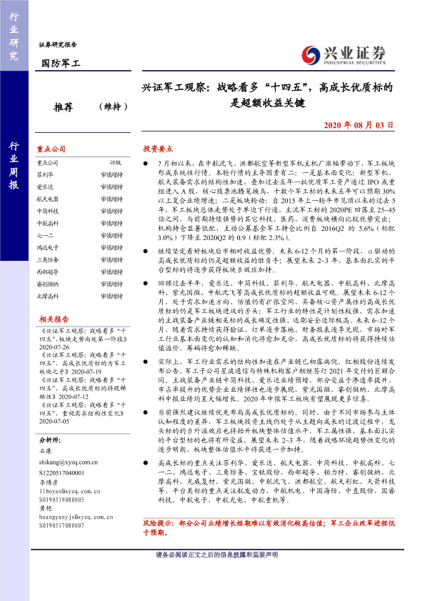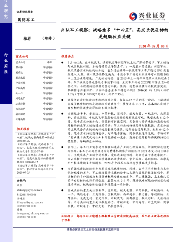 【兴业证券】【20200803】兴证军工观察:战略看多“十四五”,高成长优质标的是超额收益关键-18页
