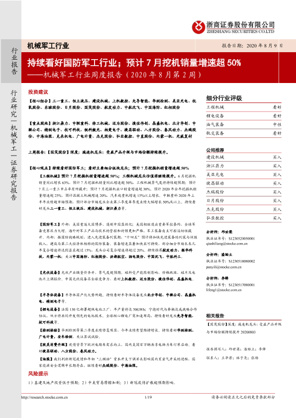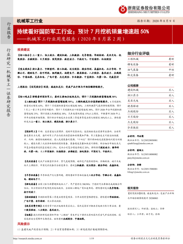 【浙商证券】【20200809】机械军工行业周度报告(2020年8月第2周):持续看好国防军工行业;预计7月挖机销量增速超50%-19页