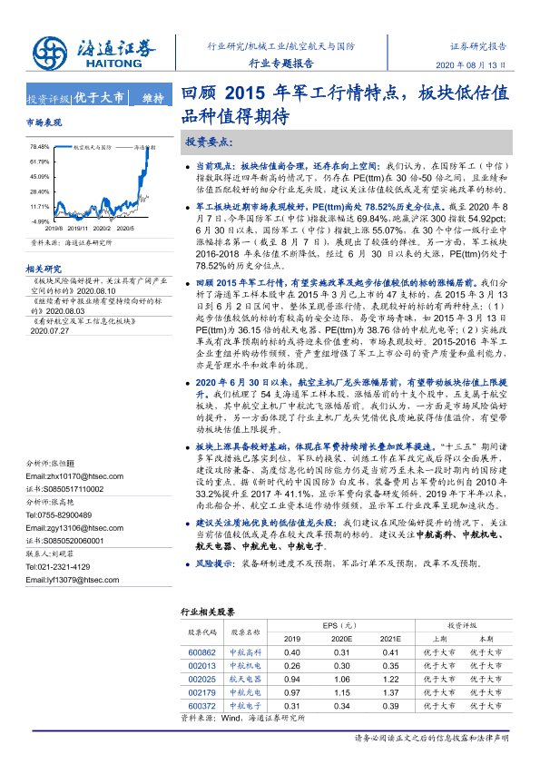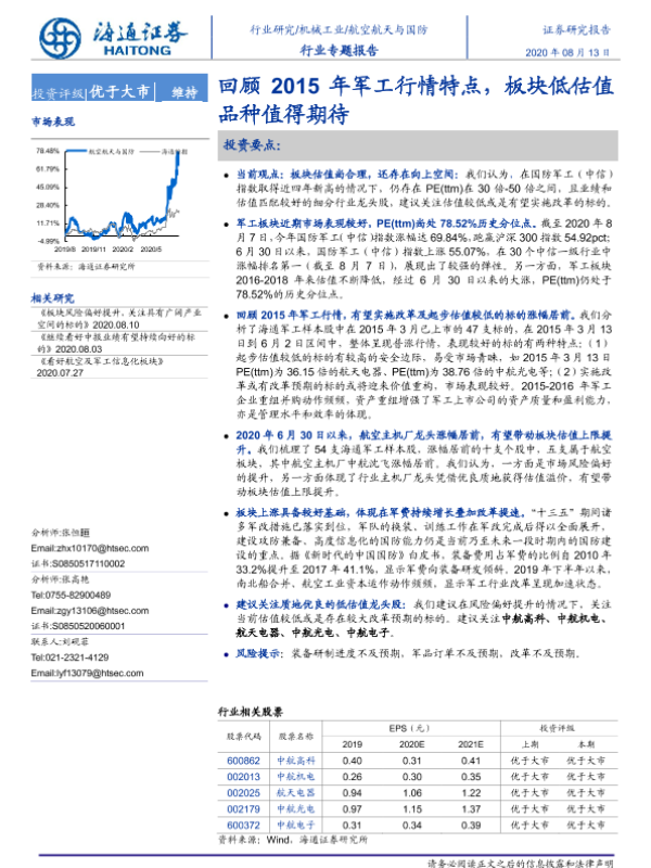 【海通证券】【20200813】20200813-海通证券-航空航天与国防行业专题报告:回顾2015年军工行情特点,板块低估值品种值得期待-20页