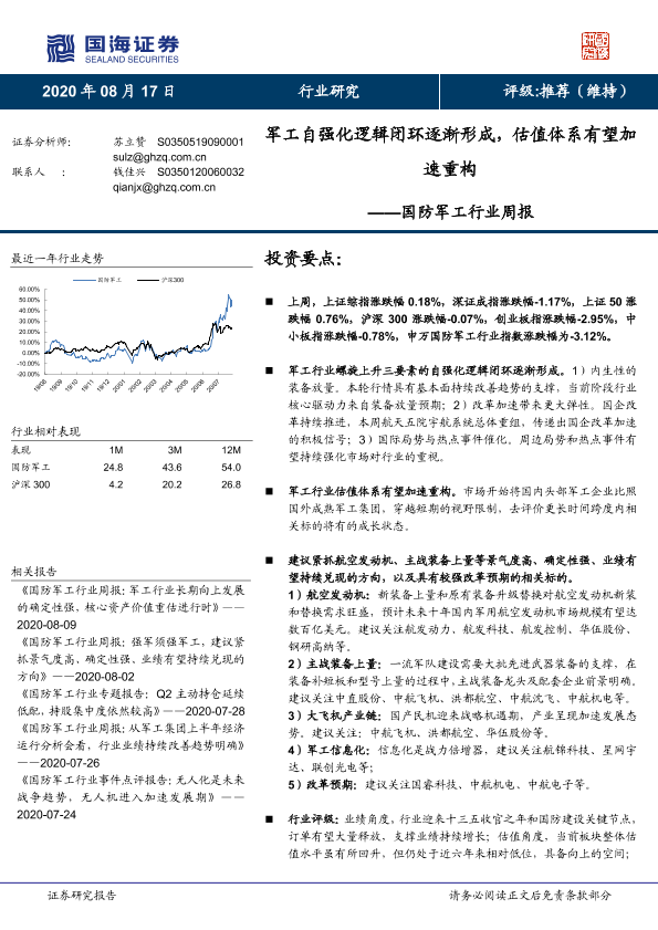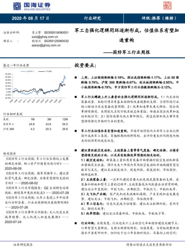 【国海证券】【20200817】国防军工行业周报:军工自强化逻辑闭环逐渐形成,估值体系有望加速重构-13页