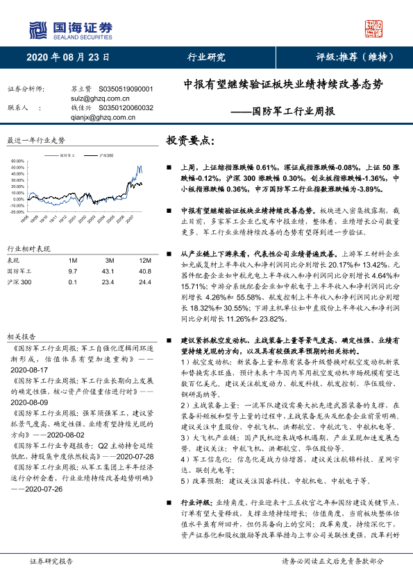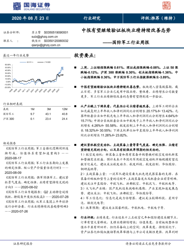 【国海证券】【20200823】国防军工行业周报:中报有望继续验证板块业绩持续改善态势-12页