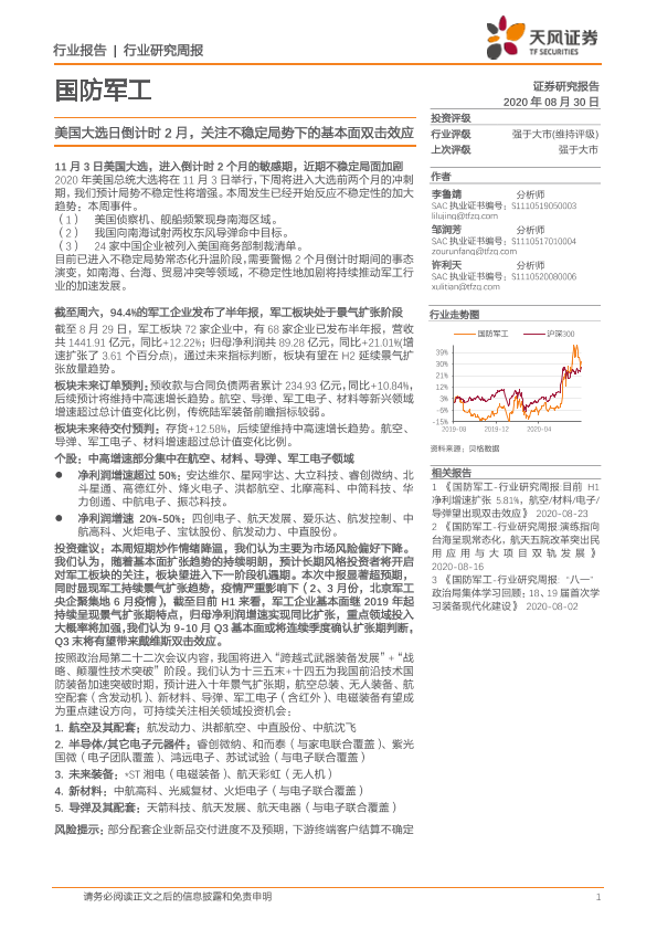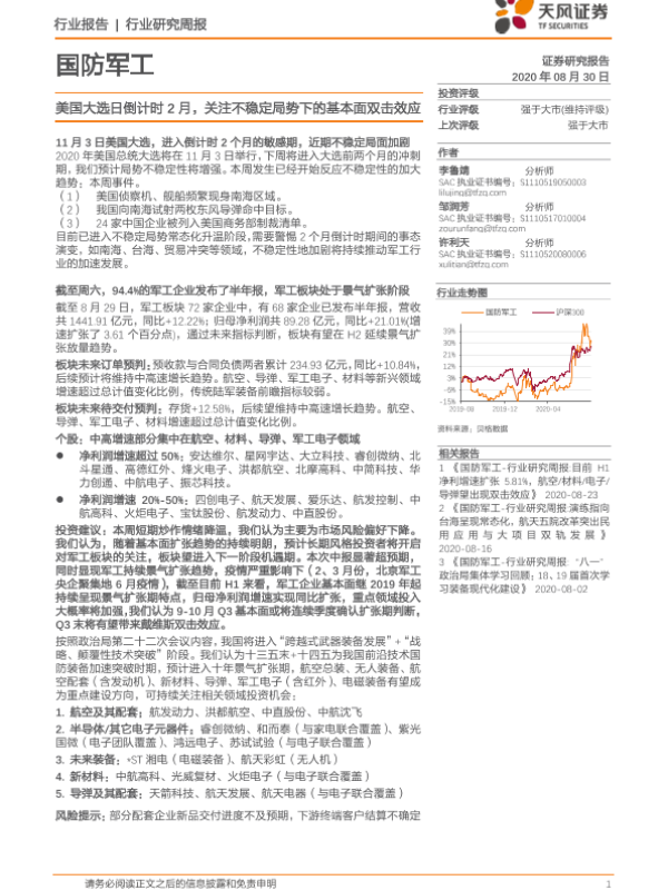 【天风证券】【20200830】国防军工行业研究周报:美国大选日倒计时2月,关注不稳定局势下的基本面双击效应-2页