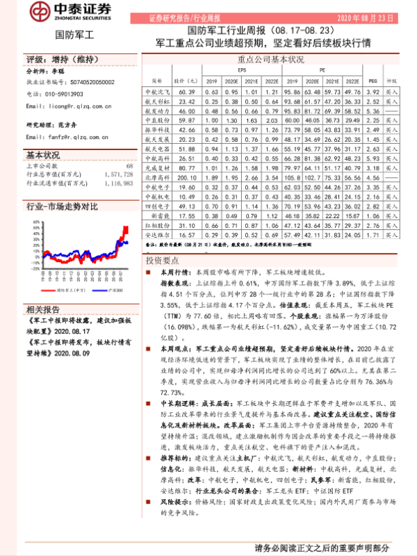【中泰证券】【20200823】国防军工行业周报:军工重点公司业绩超预期,坚定看好后续板块行情-16页