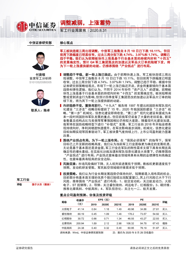【中信证券】【20200831】20200831-中信证券-军工行业周聚焦:调整减弱,上涨蓄势-4页
