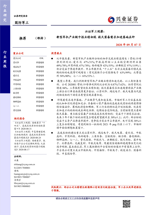 【兴业证券】【20200907】兴证军工观察:新型军机产业链中报业绩初现航天装备需求加速落地在即-14页