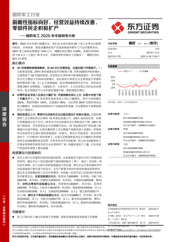 【东方证券】【20200909】国防军工2020年中报财务分析:前瞻性指标向好,经营效益持续改善,零部件民企积极扩产-25页