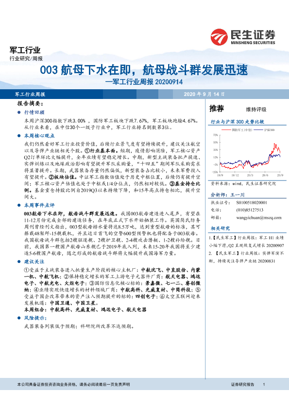 【民生证券】【20200914】20200914-民生证券-军工行业周报:003航母下水在即,航母战斗群发展迅速-17页