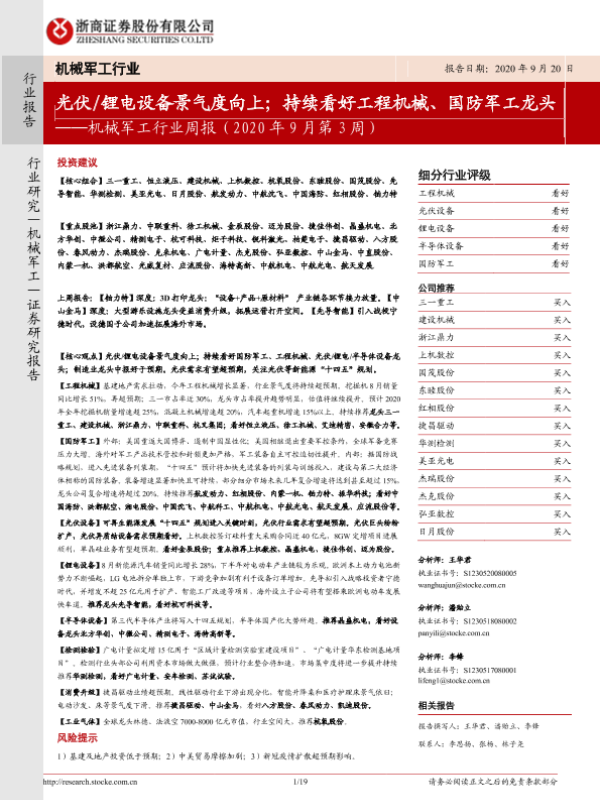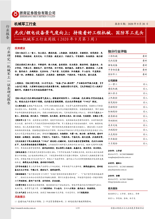 【浙商证券】【20200920】机械军工行业周报:光伏 锂电设备景气度向上;持续看好工程机械、国防军工龙头-19页