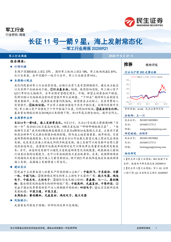 【民生证券】【20200921】20200921-民生证券-军工行业周报:长征11号一箭9星,海上发射常态化-14页