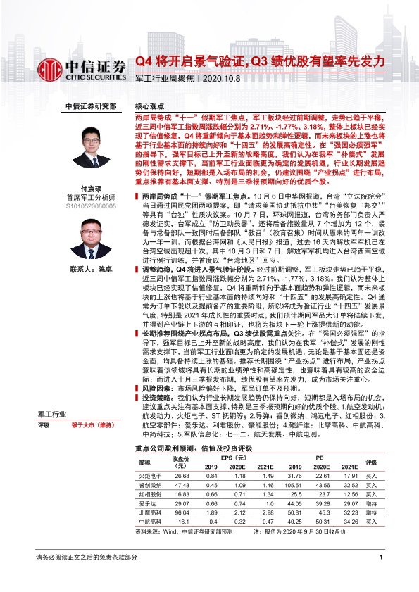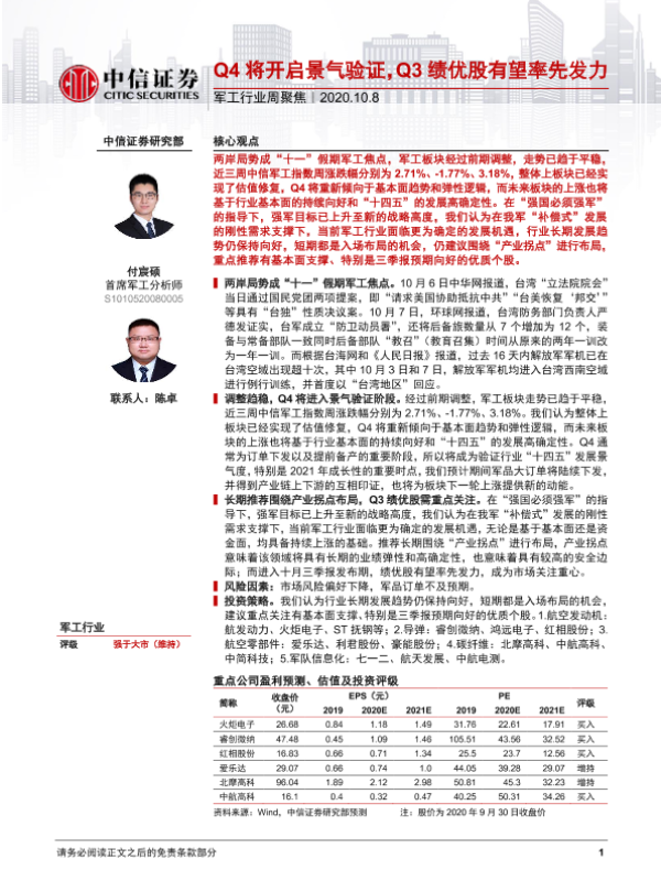 【中信证券】【20201008】20201008-中信证券-军工行业周聚焦:Q4将开启景气验证,Q3绩优股有望率先发力-2页