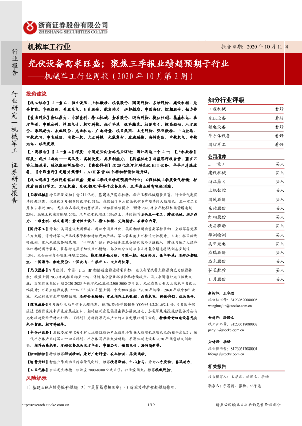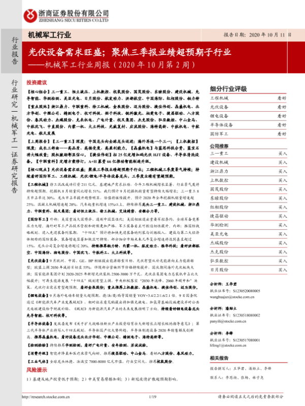 【浙商证券】【20201011】机械军工行业周报(2020年10月第2周):光伏设备需求旺盛;聚焦三季报业绩超预期子行业-19页