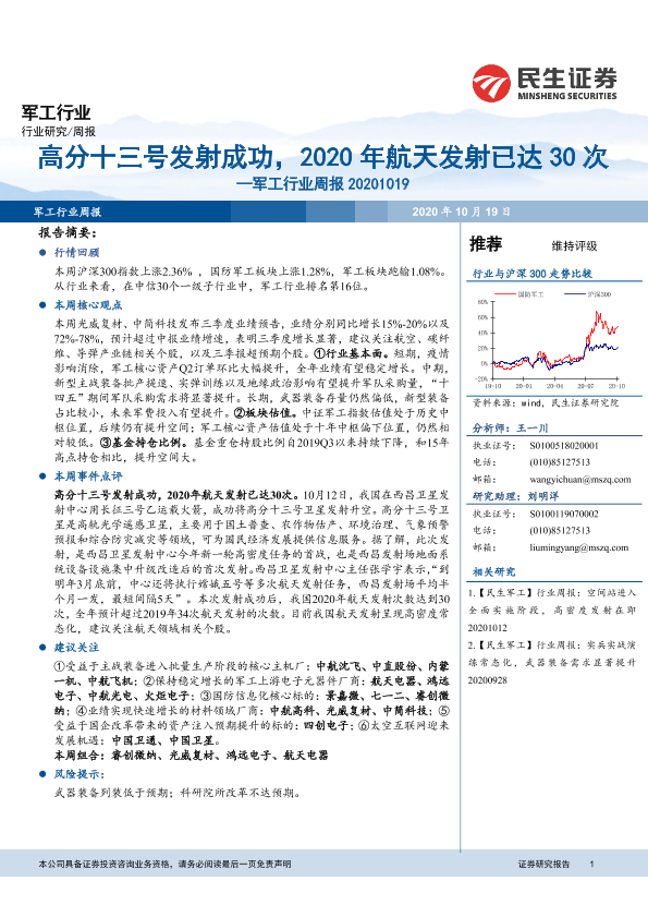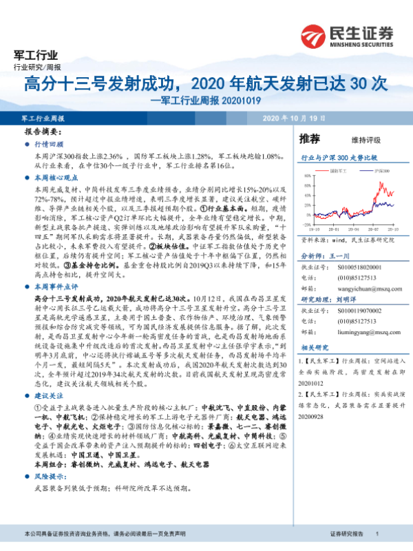 【民生证券】【20201019】20201019-民生证券-军工行业周报:高分十三号发射成功,2020年航天发射已达30次-16页