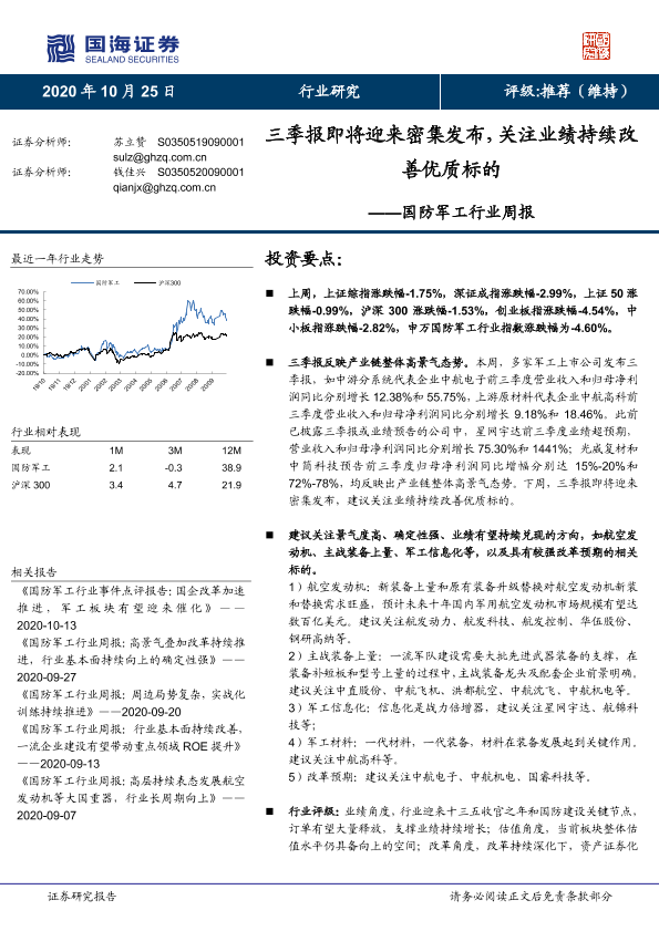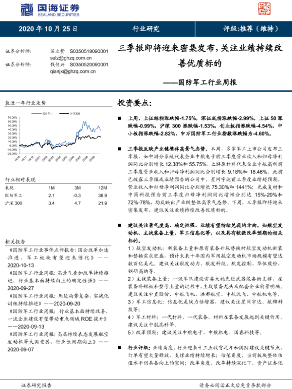 【国海证券】【20201025】国防军工行业周报:三季报即将迎来密集发布,关注业绩持续改善优质标的-12页