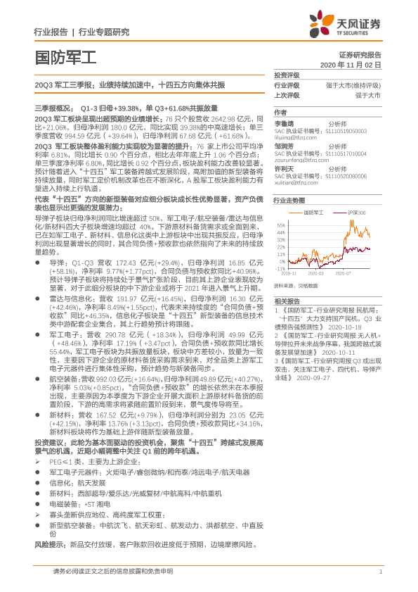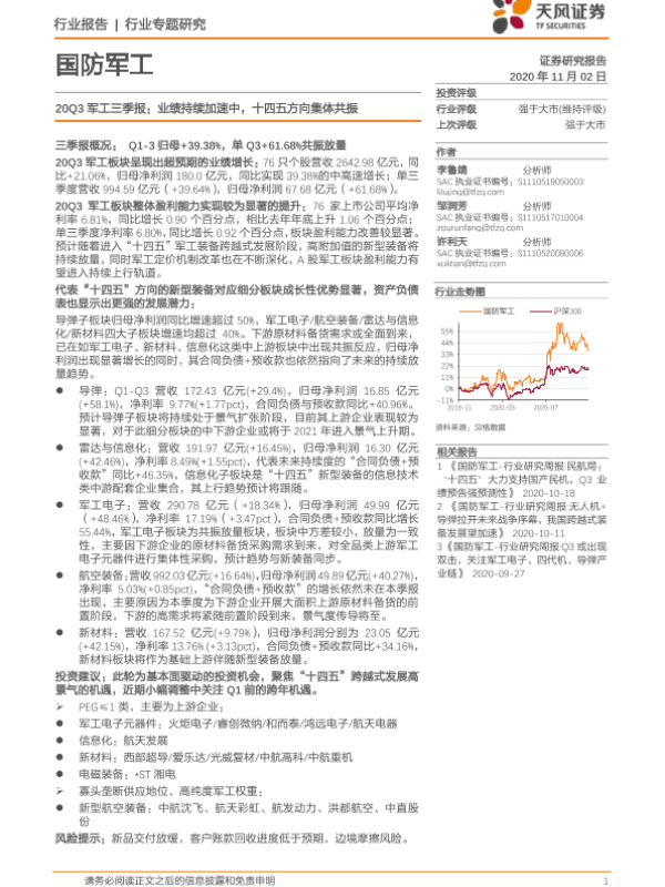 【天风证券】【20201102】20Q3军工三季报:业绩持续加速中,十四五方向集体共振-8页