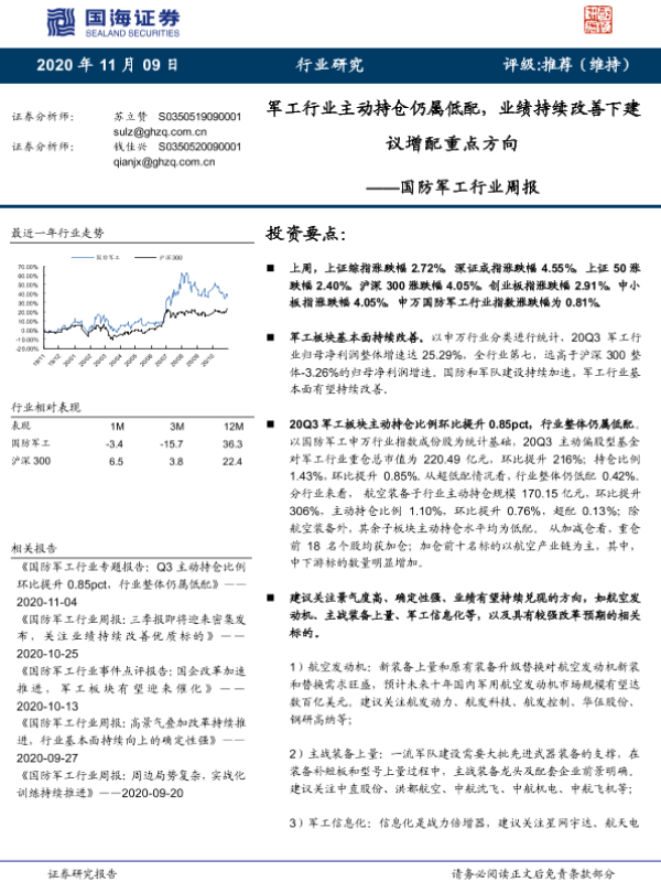 【国海证券】【20201109】20201109-国海证券-国防军工行业周报:军工行业主动持仓仍属低配,业绩持续改善下建议增配 重点方向-13页