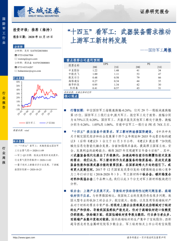 【长城证券】【20201115】20201115-长城证券-国防军工周报:“十四五”看军工:武器装备需求推动上游军工新材料发展-26页