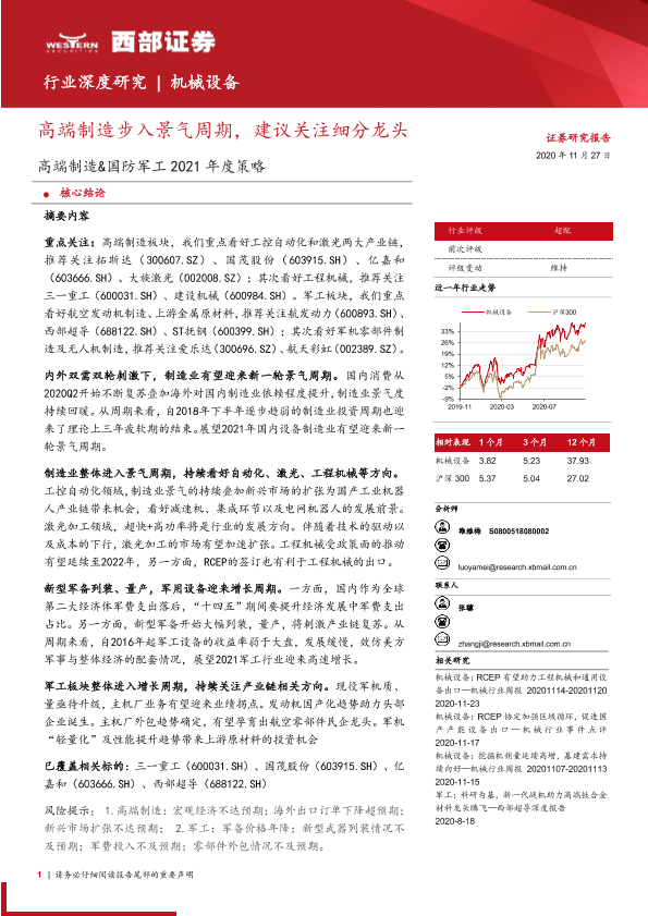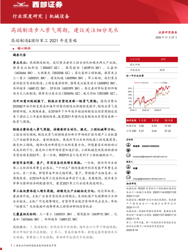 【西部证券】【20201127】高端制造&国防军工2021年度策略:高端制造步入景气周期,建议关注细分龙头-52页