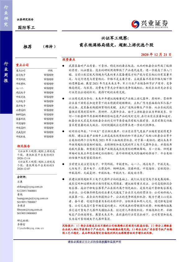 【兴业证券】【20201221】兴证军工观察:需求饱满格局稳定,超配上游优选个股-15页