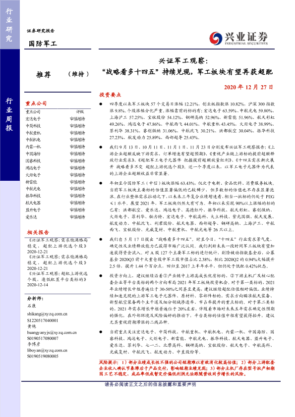 【兴业证券】【20201227】兴证军工观察:“战略看多十四五”持续兑现,军工板块有望再获超配-16页