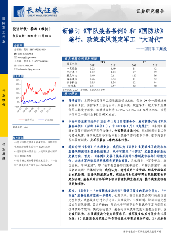【长城证券】【20210104】20210104-长城证券-国防军工周报:新修订《军队装备条例》和《国防法》施行,政策东风奠定军工“大时代”-21页