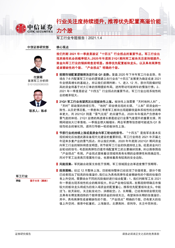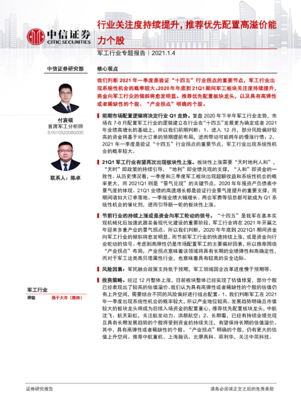 【中信证券】【20210104】军工行业专题报告:行业关注度持续提升,推荐优先配置高溢价能力个股-9页