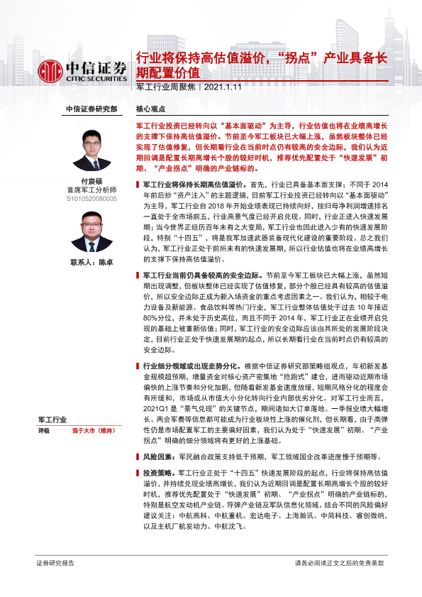 【中信证券】【20210111】军工行业周聚焦:行业将保持高估值溢价,“拐点”产业具备长期配置价值-3页