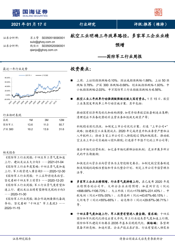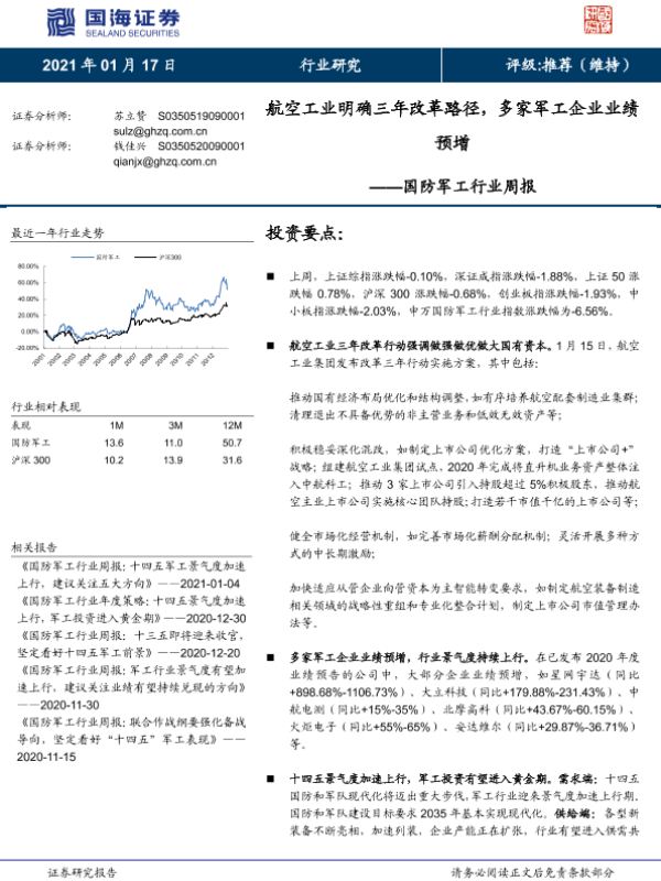 【国海证券】【20210117】国防军工行业周报:航空工业明确三年改革路径,多家军工企业业绩预增-13页