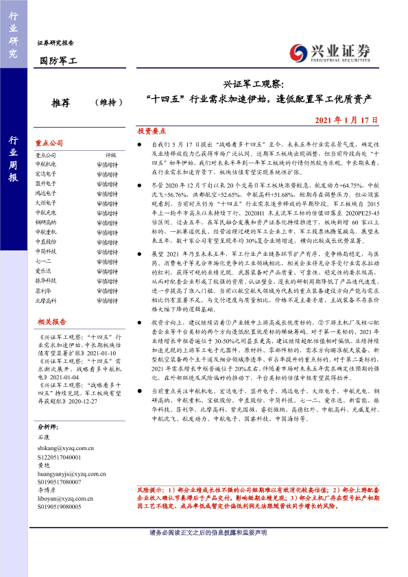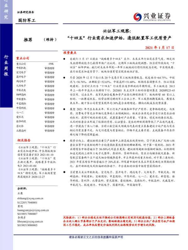 【兴业证券】【20210117】兴证军工观察:“十四五”行业需求加速伊始,逢低配置军工优质资产-14页