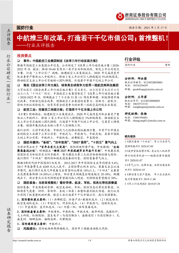 【浙商证券】【20210117】国防行业点评报告:中航推三年改革,打造若干千亿市值公司;首推整机!-4页