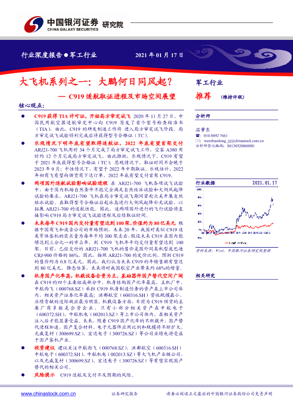 C919 军工行业 大飞机产业 市场空间 适航取证