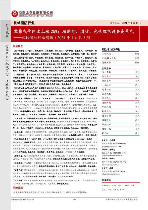 【浙商证券】【20210117】机械国防行业周报(2021年1月第3周):零售气价同比上涨25%;顺周期、国防、光伏锂电设备高景气-22页