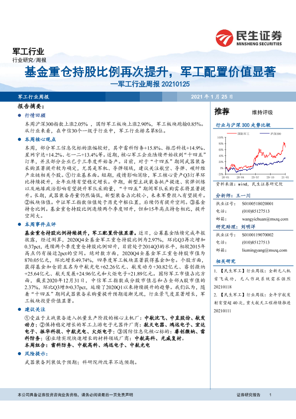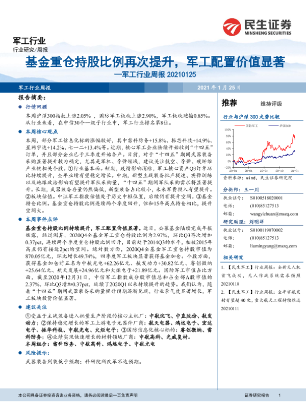 【民生证券】【20210125】20210125-民生证券-军工行业周报:基金重仓持股比例持续提升,军工配置价值显著-16页
