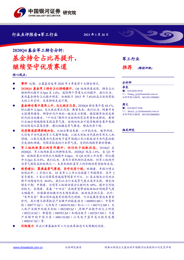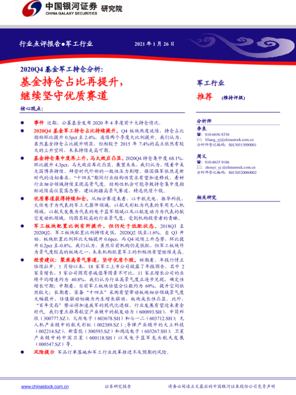 【银河证券】【20210126】2020Q4基金军工持仓分析:基金持仓占比再提升,继续坚守优质赛道-5页