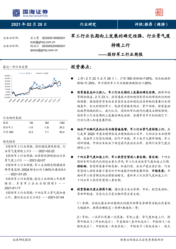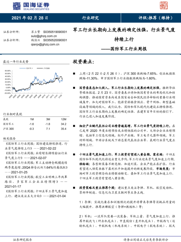 【国海证券】【20210228】20210228-国海证券-国防军工行业周报:军工行业长期向上发展的确定性强,行业景气度持续上行-12页