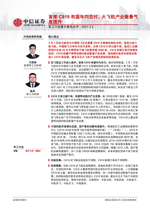 【中信证券】【20210302】20210302-中信证券-军工行业重大事项点评:首架C919有望年内交付,大飞机产业链景气度提升-3页