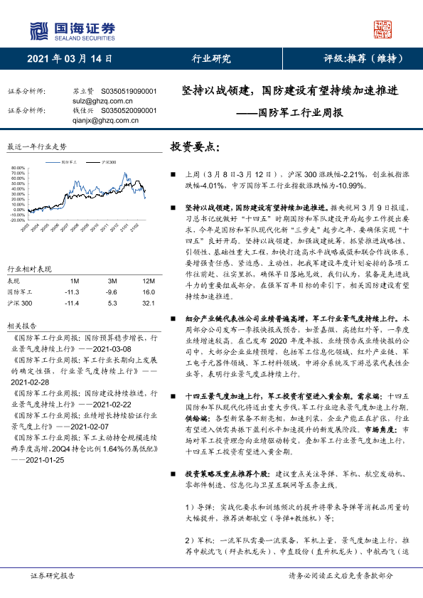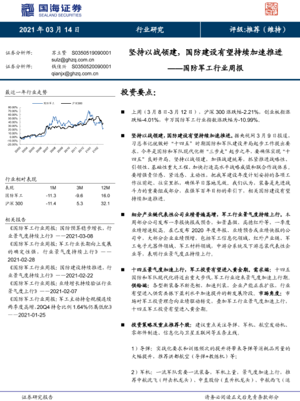 【国海证券】【20210314】国防军工行业周报:坚持以战领建,国防建设有望持续加速推进-12页