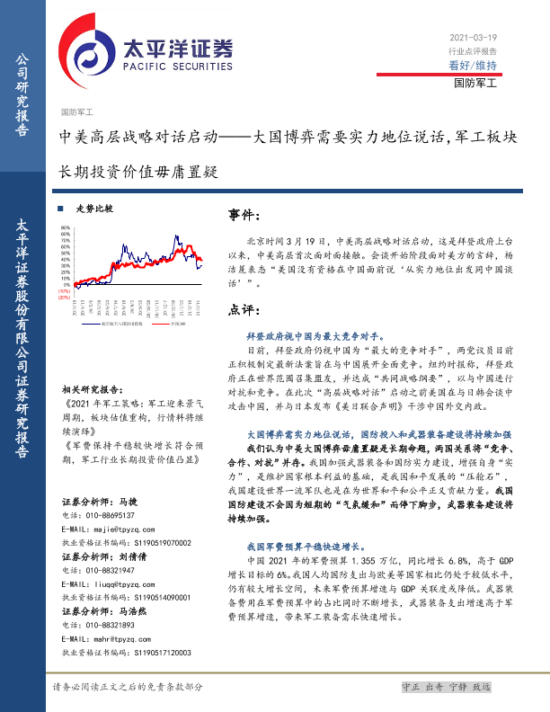 【太平洋证券】【20210319】国防军工行业:中美高层战略对话启动:大国博弈需要实力地位说话,军工板块长期投资价值毋庸置疑-5页