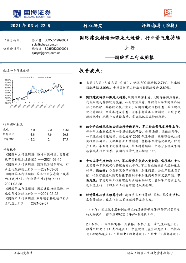 【国海证券】【20210322】国防军工行业周报:国防建设持续加强是大趋势,行业景气度持续上行-13页
