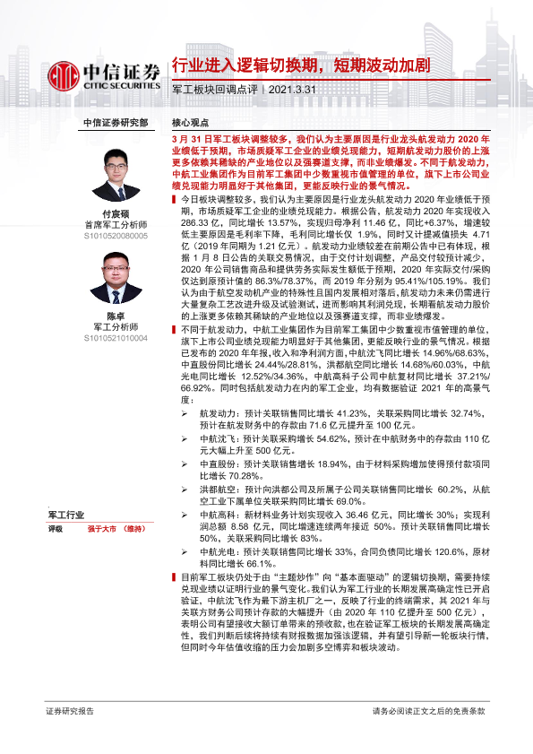 【中信证券】【20210331】军工板块回调点评:行业进入逻辑切换期,短期波动加剧-3页