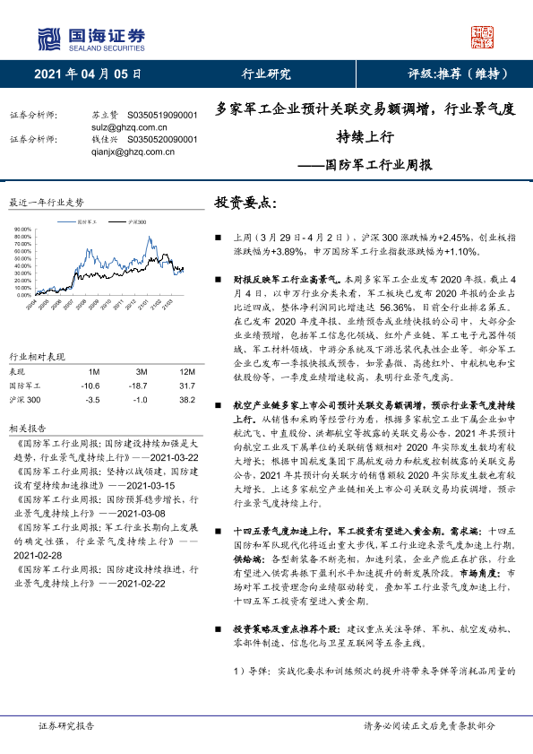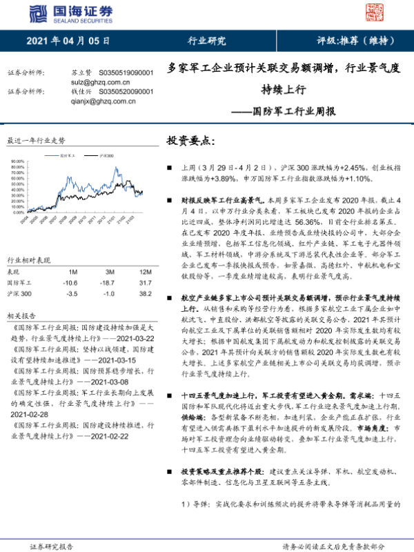 【国海证券】【20210405】国防军工行业周报:多家军工企业预计关联交易额调增,行业景气度持续上行-13页