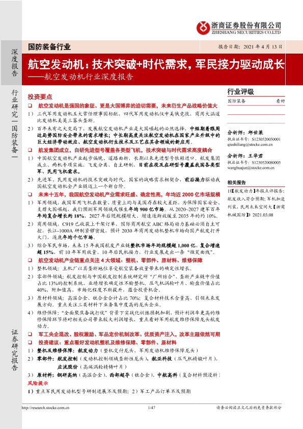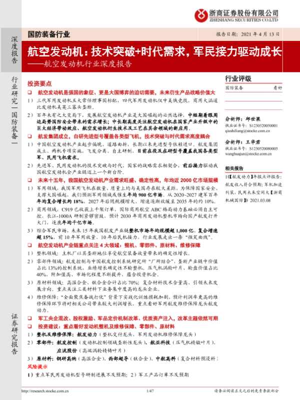 【浙商证券】【20210413】20210413-浙商证券-航空发动机行业深度报告:航空发动机:技术突破+时代需求,军民接力驱动成长-47页