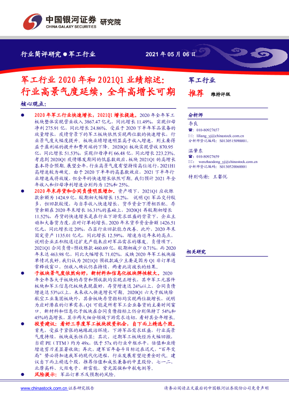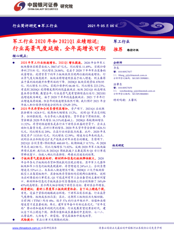 【银河证券】【20210506】军工行业2020年和2021Q1业绩综述:行业高景气度延续,全年高增长可期-9页