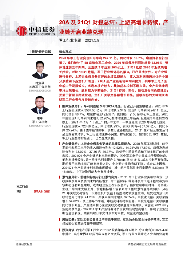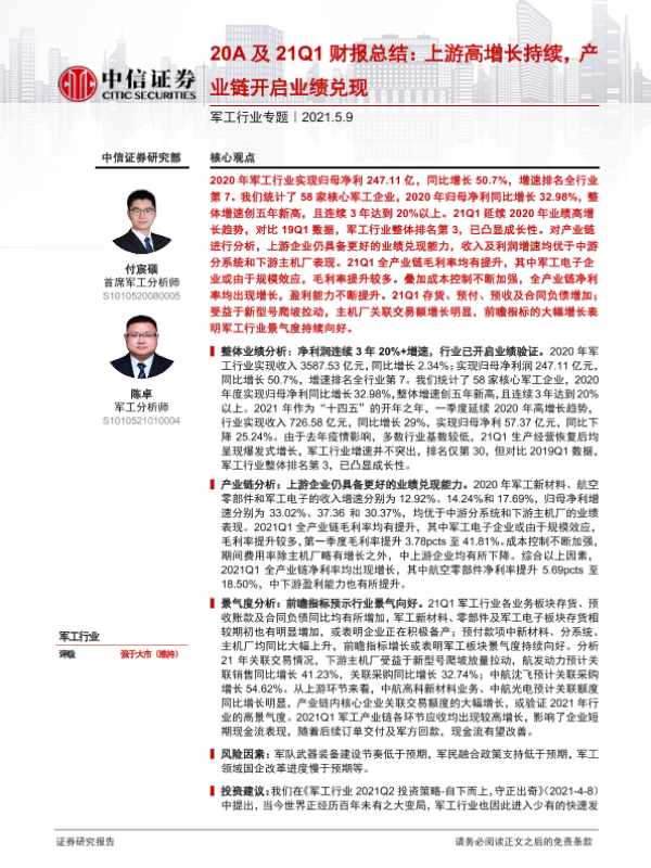 【中信证券】【20210509】20210509-中信证券-军工行业专题:20A及21Q1财报总结:上游高增长持续,产业链开启业绩兑现-15页