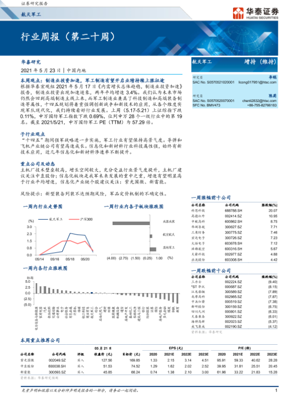 【华泰证券】【20210523】20210523-华泰证券-航天军工行业周报(第二十周)-12页