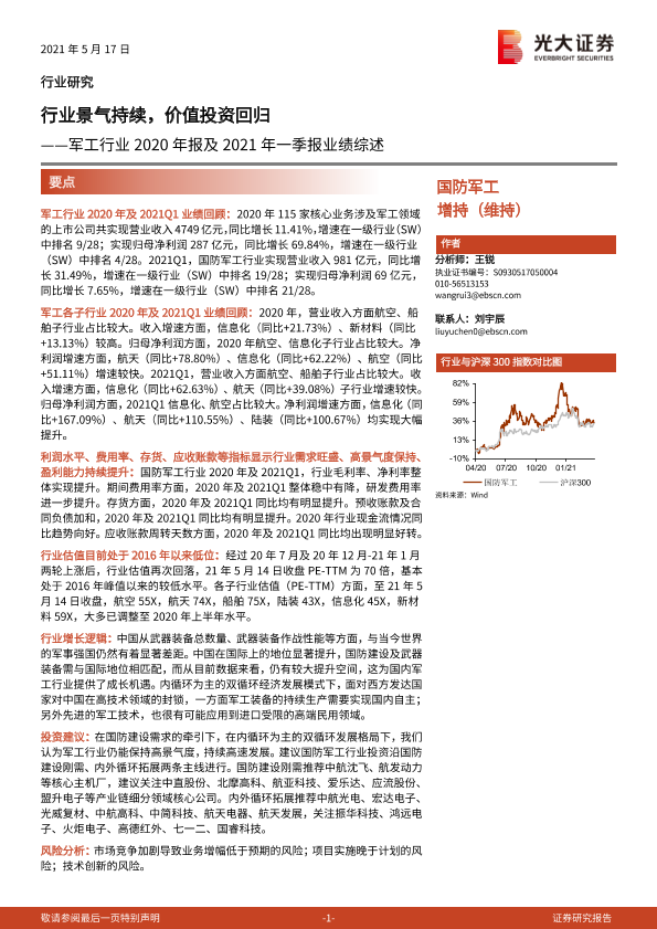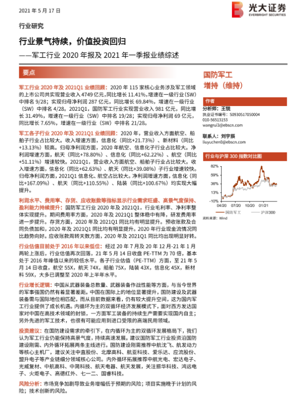 【光大证券】【20210517】军工行业2020年报及2021年一季报业绩综述:行业景气持续,价值投资回归-26页