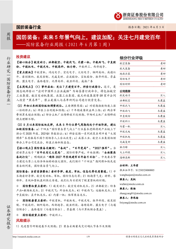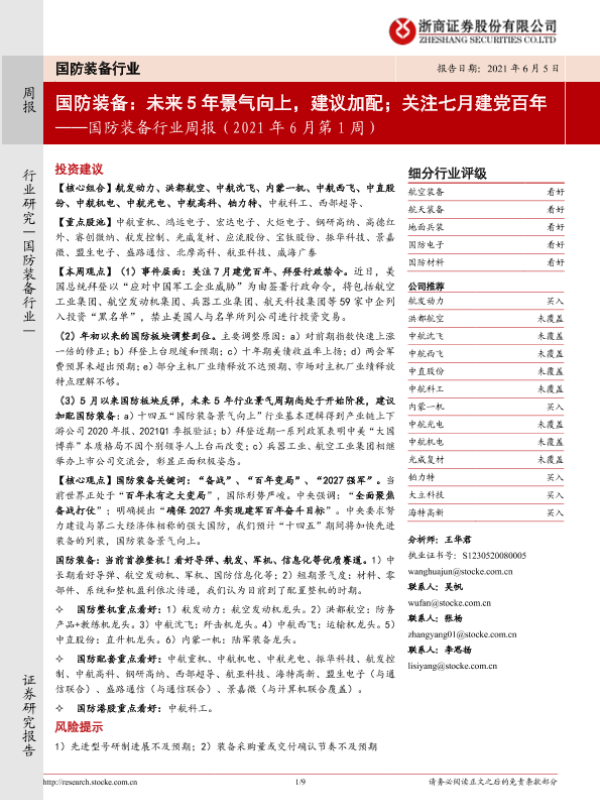 【浙商证券】【20210605】国防装备行业周报(2021年6月第1周):国防装备:未来5年景气向上,建议加配;关注七月建党百年-9页
