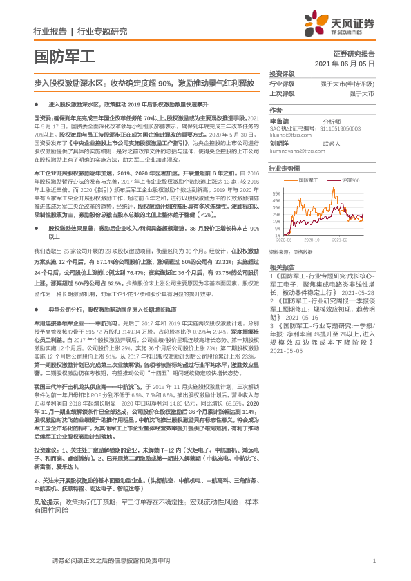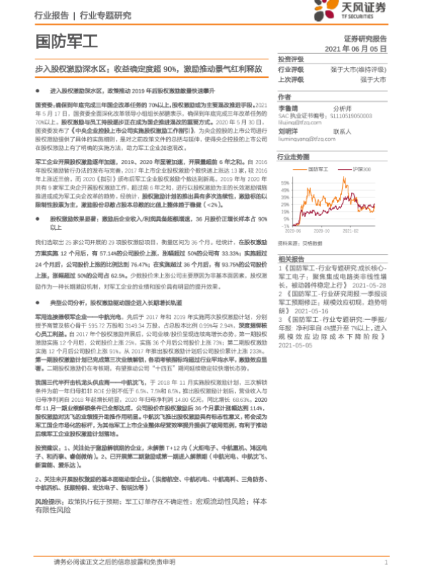 【天风证券】【20210605】20210605-天风证券-国防军工行业专题研究:步入股权激励深水区:收益确定度超90%,激励推动景气红利释放-17页